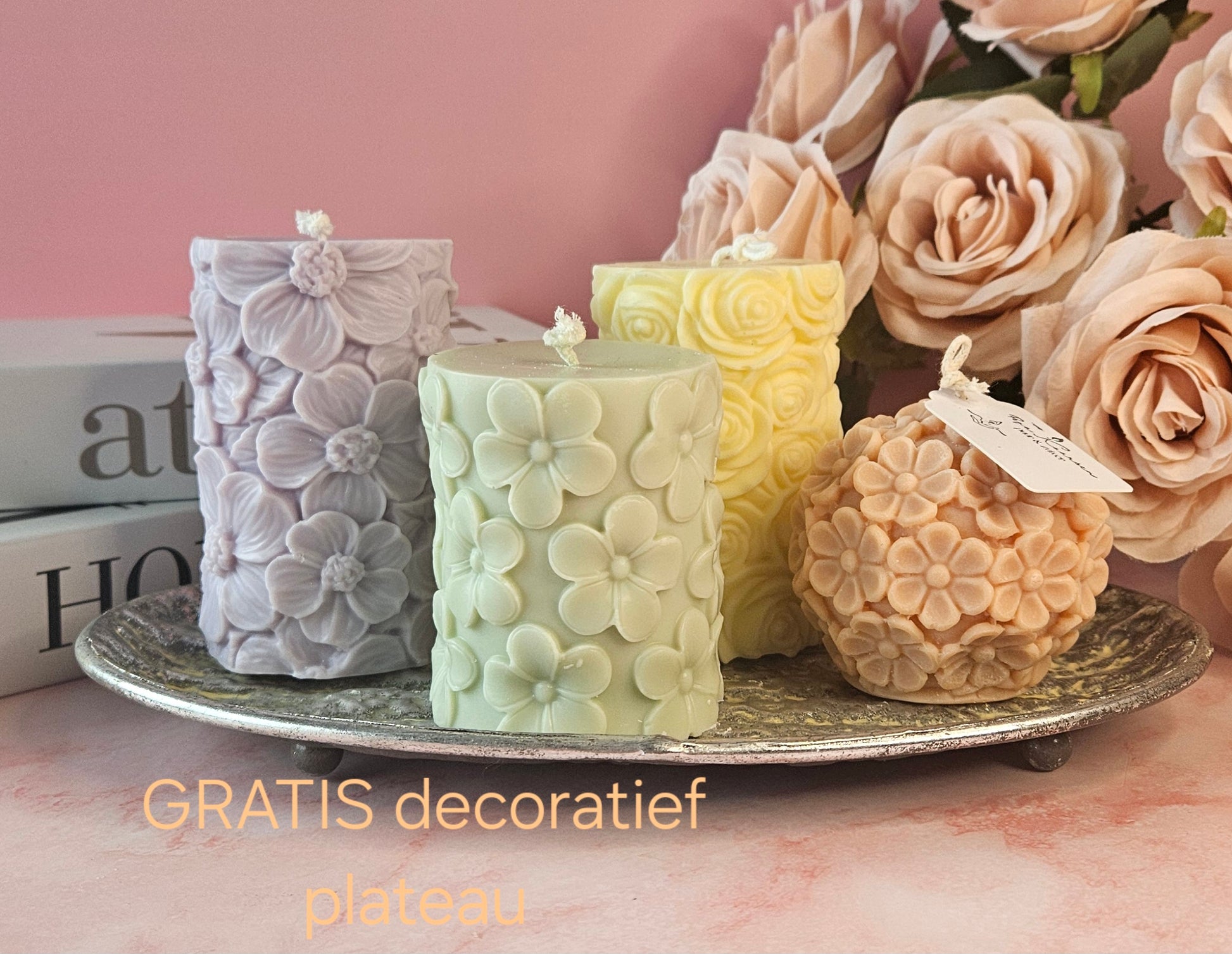 Vier de mooie nazomerse momenten met deze zacht gekleurde kaarsenset met gratis decoratief plateau. De romantische bloemenstructuur en zachte pastelkleuren brengen warmte en sfeer in huis, perfect om nog wat langer van die zomerse gezelligheid te genieten