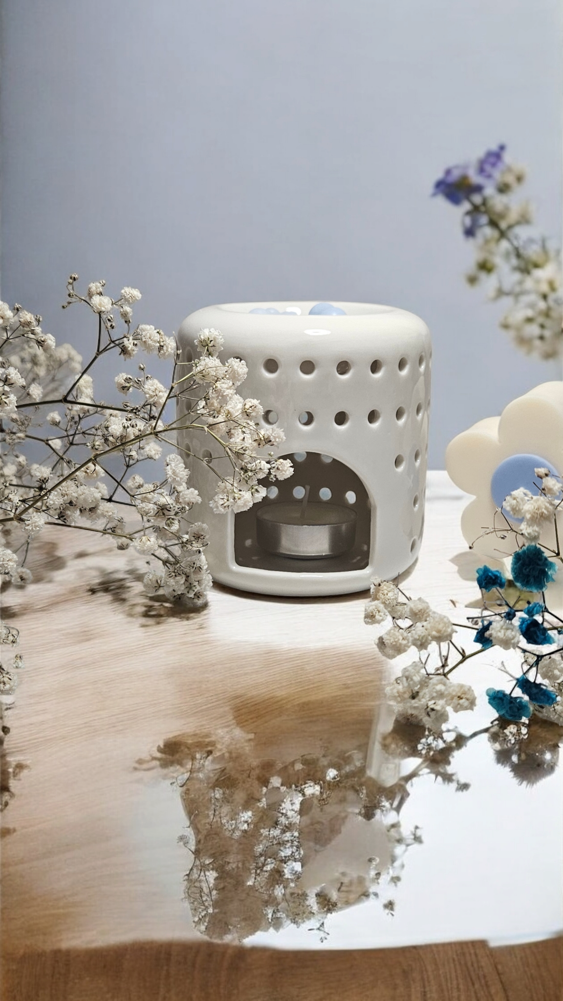 Deze waxbrander heeft een rond ontwerp en is uitgevoerd in een glanzende witte kleur. De brander heeft een stijlvol patroon van ronde gaatjes rondom, waardoor het kaarslicht een sfeervol en warm effect creëert. Onderin is er een open ruimte waar een theelichtje geplaatst kan worden, terwijl bovenop ruimte is voor een waxmelt of geurolië. Het moderne maar speelse ontwerp maakt deze waxbrander een perfecte aanvulling op elk interieur.