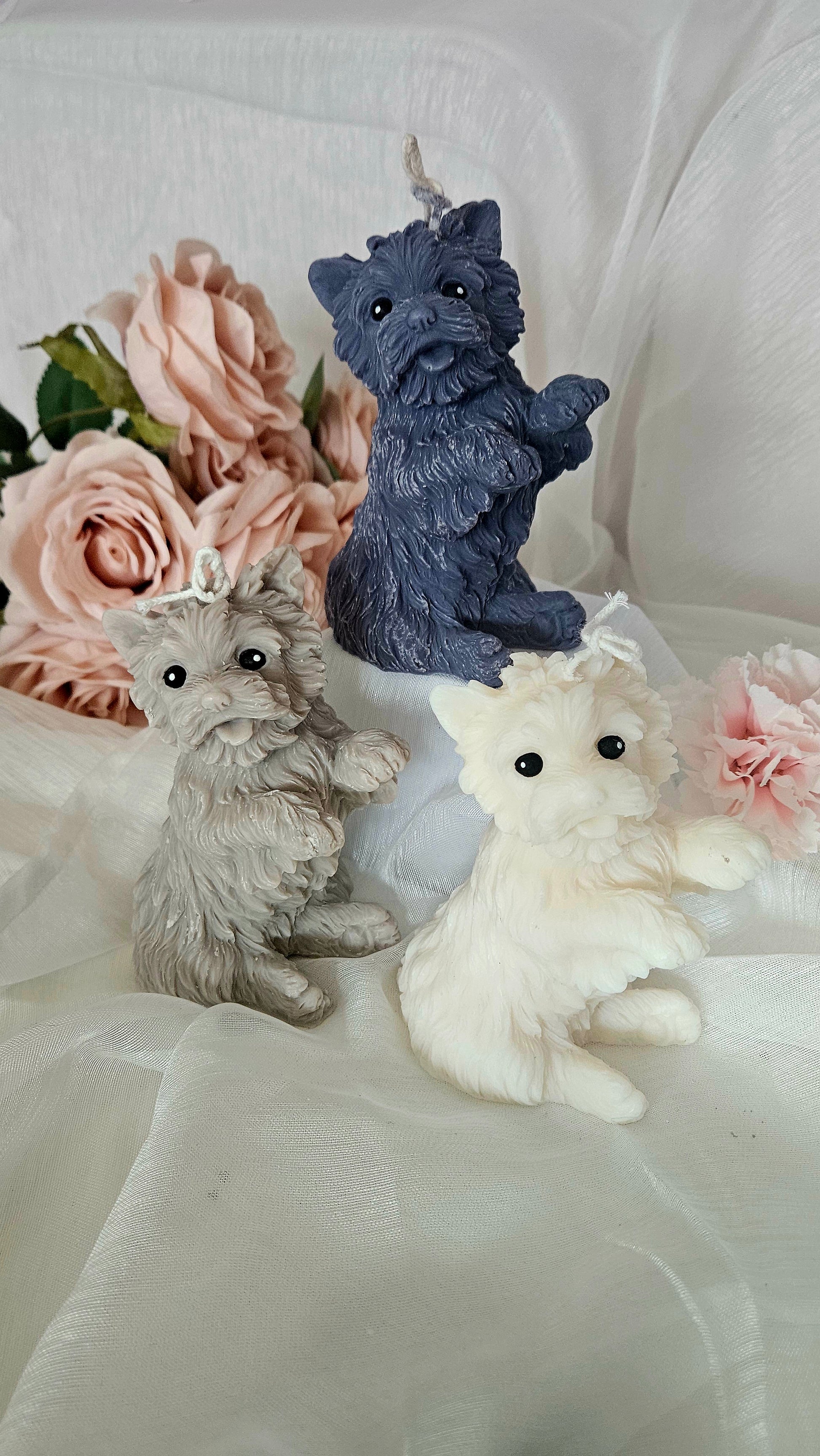 Deze Yorkshire Terrier kaars is klein, stijlvol en vol karakter – precies zoals het hondje zelf! Hij heeft een schattig strikje op zijn kopje. Gemaakt van natuurlijke sojawas en met de hand gegoten, dus elk exemplaar is uniek.